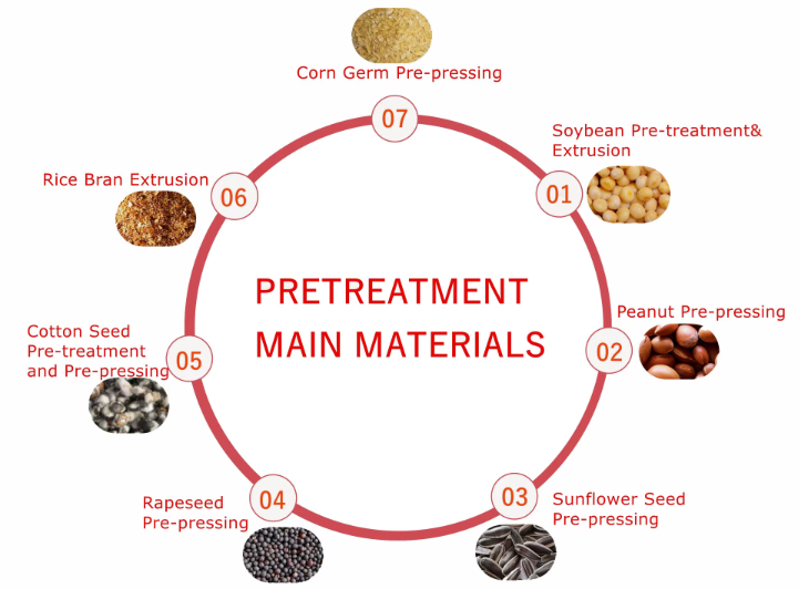 Le matériau d’extraction par solvant est l’huile de graines de céréales pré-pressée. Le prétraitement et le pré-pressage comprennent principalement le nettoyage, l’extrusion, le floconnage, le décorticage et le pré-pressage, etc. Compte tenu des différentes caractéristiques des graines d’huile et des exigences des clients, nous pouvons vous fournir la conception spéciale afin d’ajuster les graines oléagineuses à l’état optimal, ce qui améliorera le rendement en huile et la qualité de l’huile et du tourteau, et peut fournir les meilleures matières premières pour la section suivante.